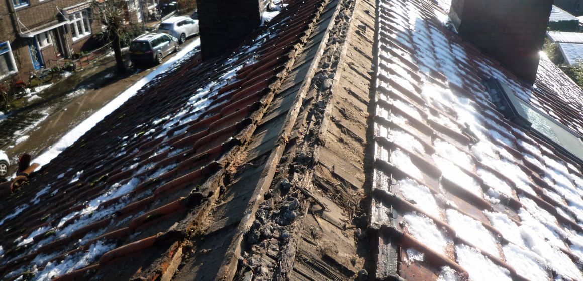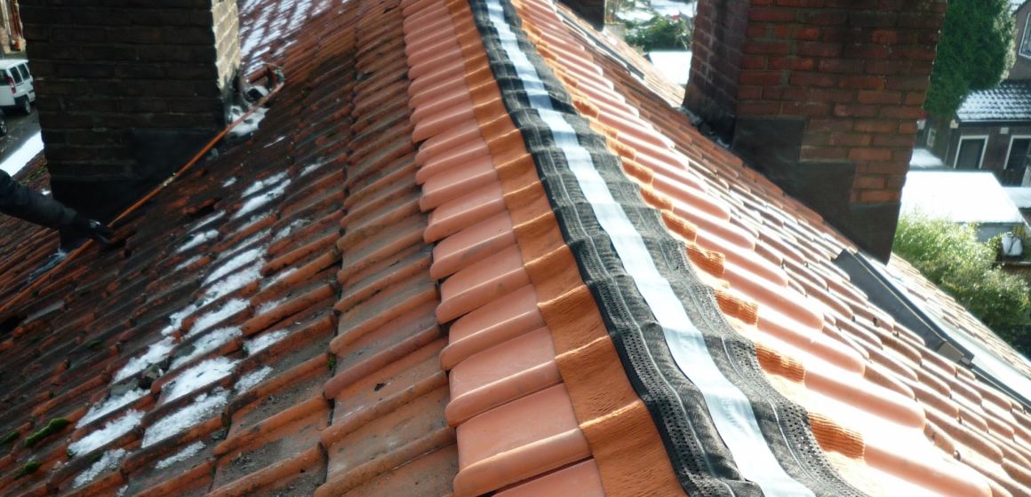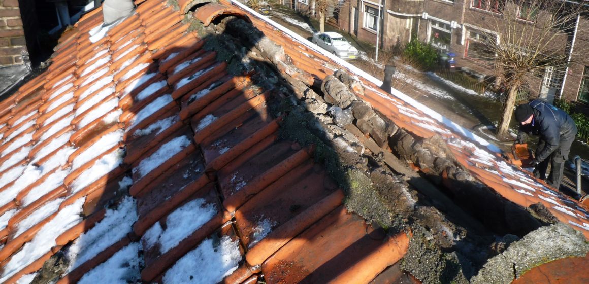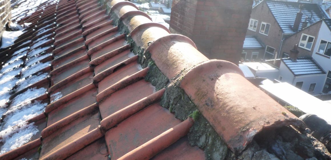 Hier hebben wij in Dordrecht de nokpannen vervangen. De oude nokpannen lagen erg los en het cement was hier en daar af aan het brokkelen. Als het met een bepaalde wind regent of de regen staat schuin op de nokpannen kan het er in regenen, en ontstaat er ernstige lekkage!